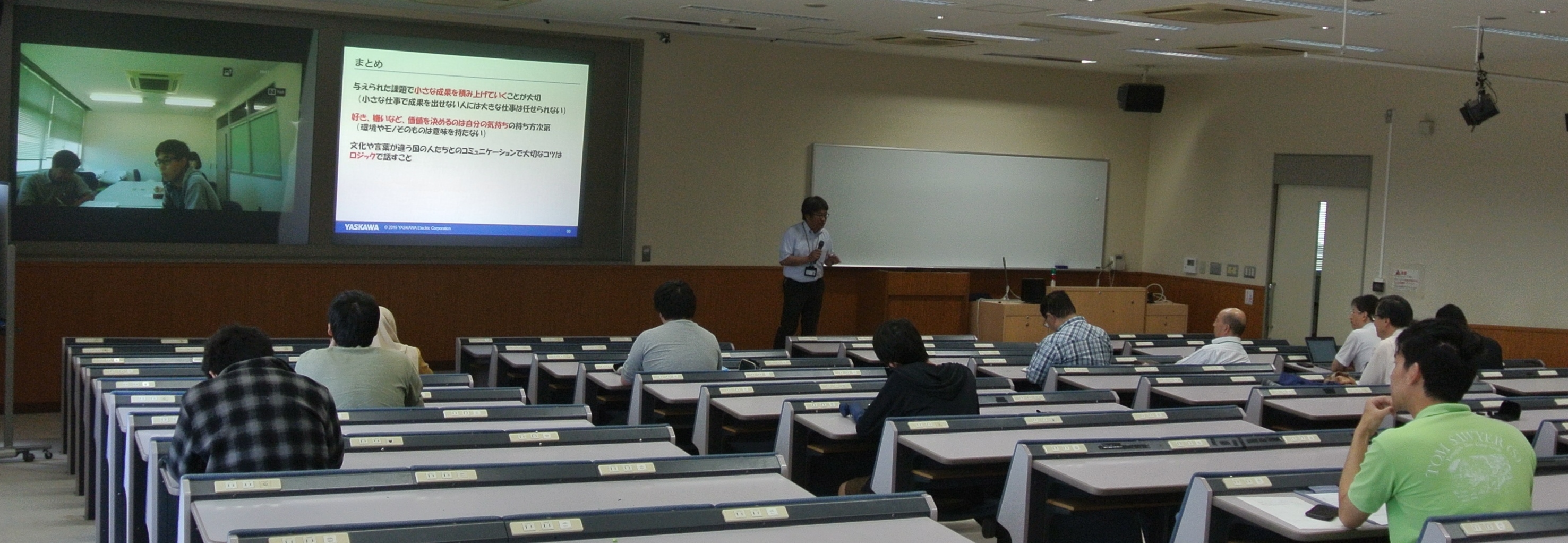 内容は、ご自身の紹介に始まり、勤務先である安川電機の歴史や現在の事業から、主力製品である産業用ロボットの話や、海外勤務の経験など、分かり易くご披露いただきました。