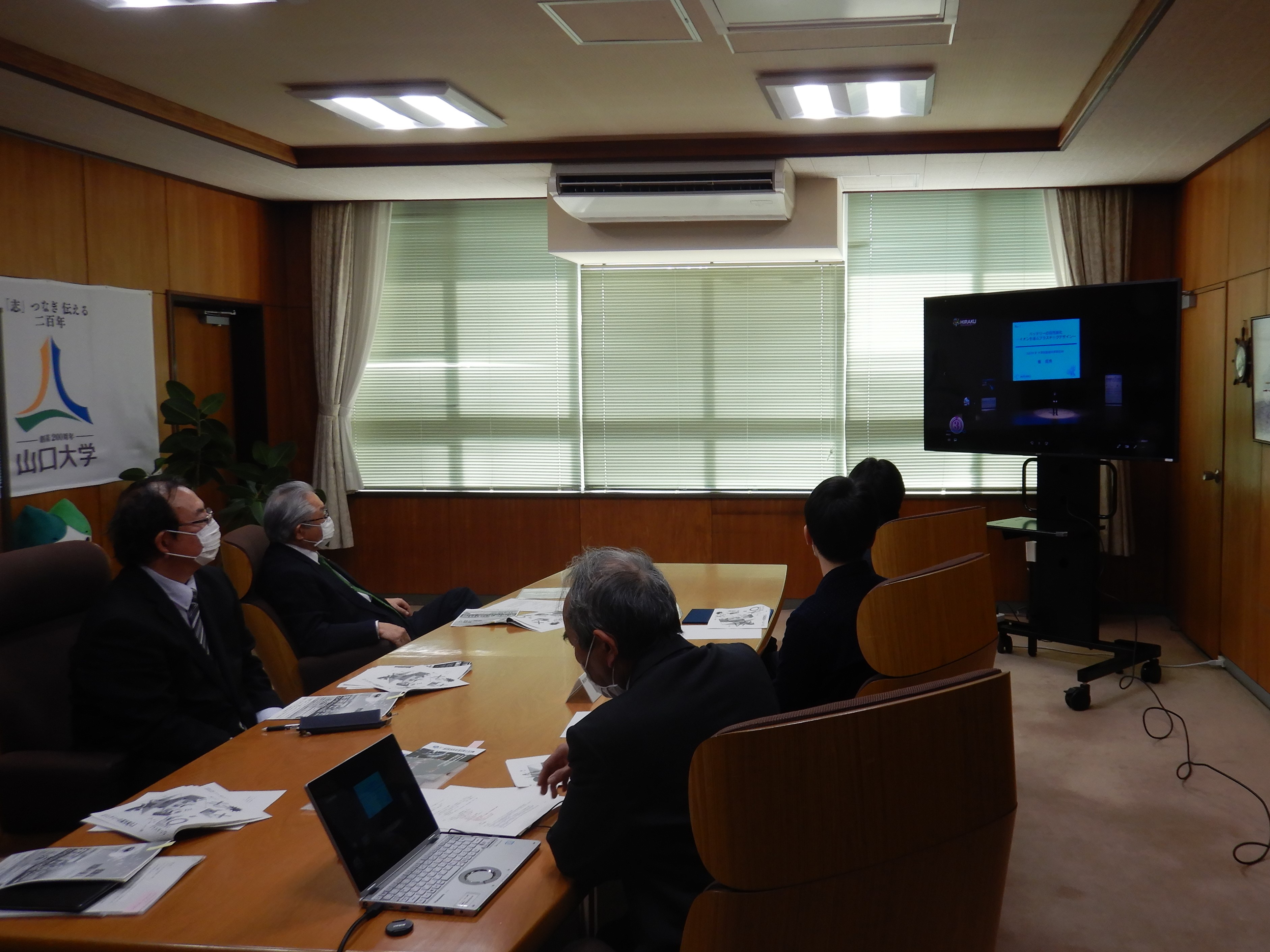 この日は、「未来博士3分間コンペティション2019」で戸田工業賞を受賞した大学院創成科学研究科(工)博士後期課程3年の崔 亮秀(さい りゃんす)さんと、「未来博士3分間コンペティション2020」で最優秀賞(日本語部門)とマツダ動画賞をダブルで受賞した創成科学研究科(工)博士後期課程1年の山田耕輝(やまだ こうき)さんが、関係者と共に学長を訪れました。最初にコンペティションの概要が紹介されたあと、崔さんと山田さんがそれぞれの発表の動画とともに紹介されました。