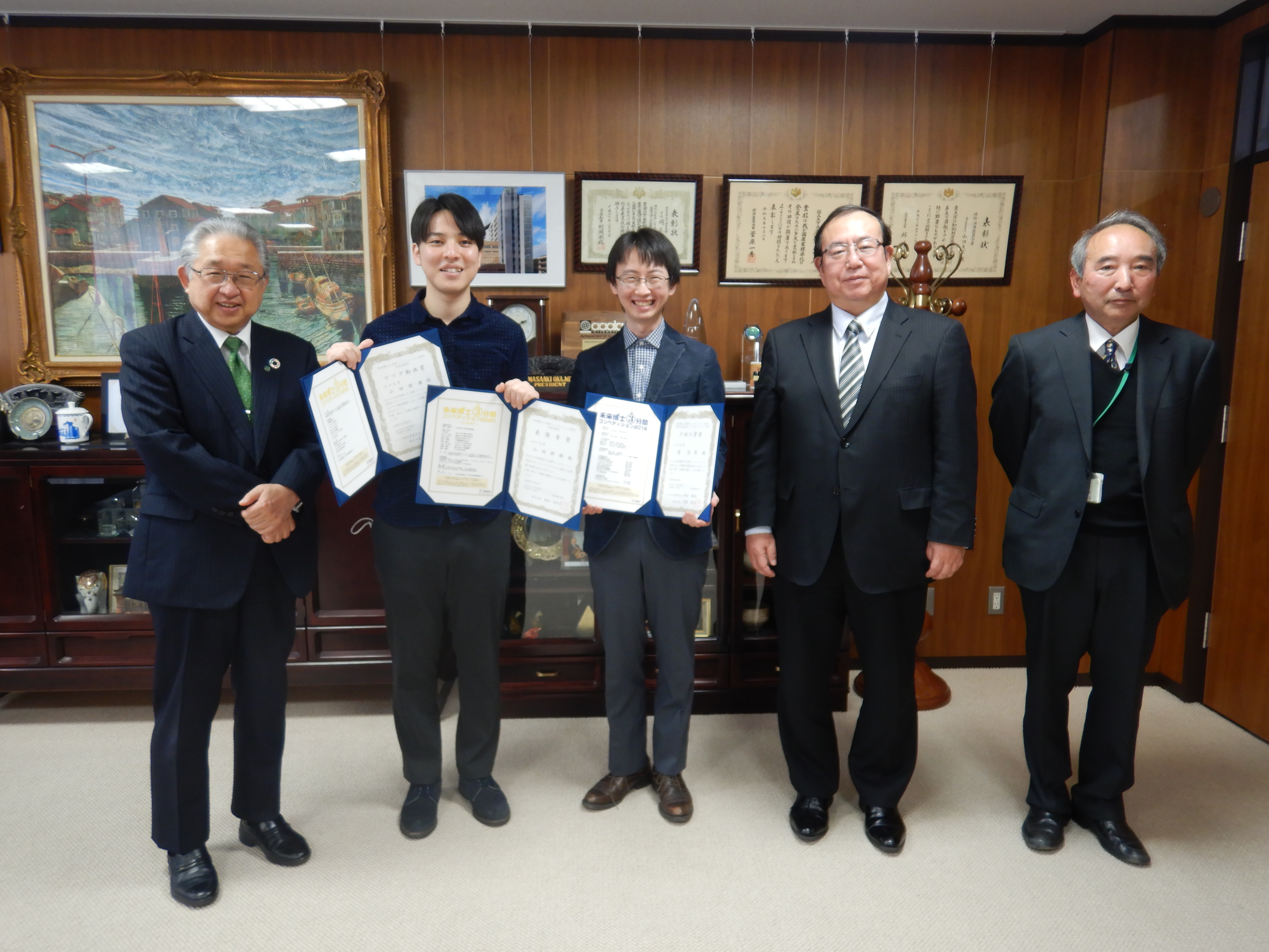 1月21日(木)、「未来博士3分間コンペティション2019」(令和元年9月14日開催)と「未来博士3分間コンペティション2020」(令和2年11月21日開催)の受賞者が、上西研理事・副学長(学術研究担当)など関係者らとともに岡正朗学長を訪問し、受賞の報告をしました。
