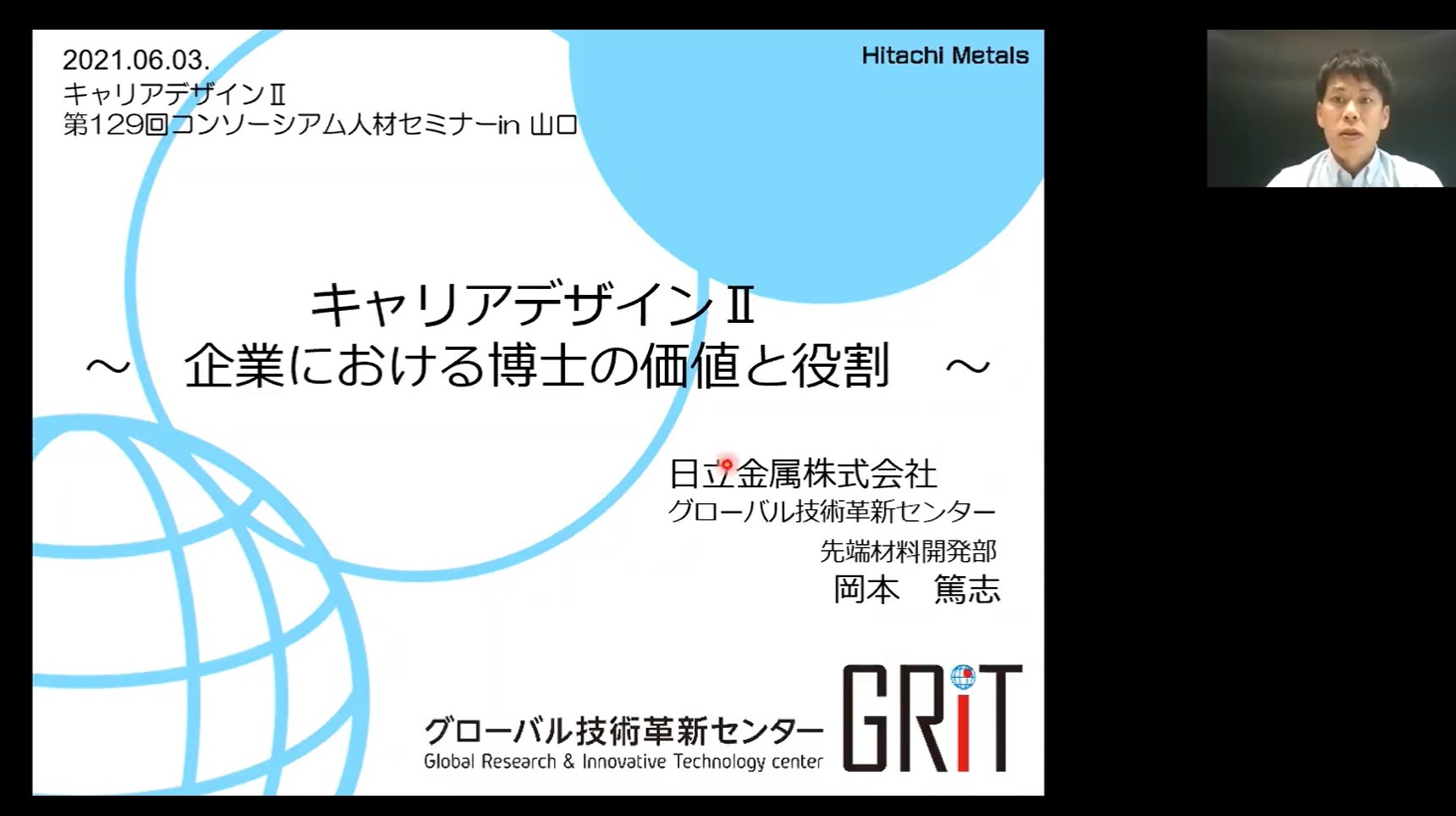 冒頭の望月信介教授(キャリアパスデザイン推進室長)の挨拶と、HIRAKU事業担当者による同事業の紹介に続き、講師の岡本篤志氏から「企業における博士の価値と役割」と題した講演をいただきました。岡本氏は本学の工学部応用化学工学科を卒業され、直ちに大学院博士前期課程に進学され、修了後は日立金属株式会社に入社され、研究開発に従事された後、本学大学院博士後期課程に社会人入学され、博士(工学)の学位を取得されました。現在は、同社のグローバル技術革新センターで主任研究員を務めておられます。