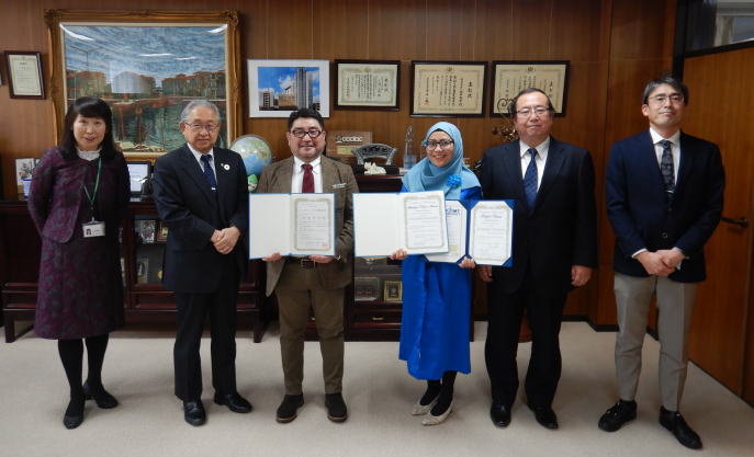 2022年3月11日(金)、「未来博士3分間コンペティション2021」の受賞者と指導教員が、上西研副学長(学術研究担当)や関係者らとともに岡正朗学長を訪問し、受賞の報告をしました。