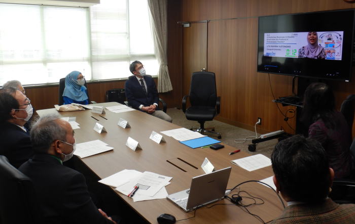 報告には、Litaさんと指導教員の日下部教授、伊藤さんと指導教員の小柴准教授が出席し、受賞者2名のプレゼンテーション動画を見ながら岡学長らと懇談しました。
