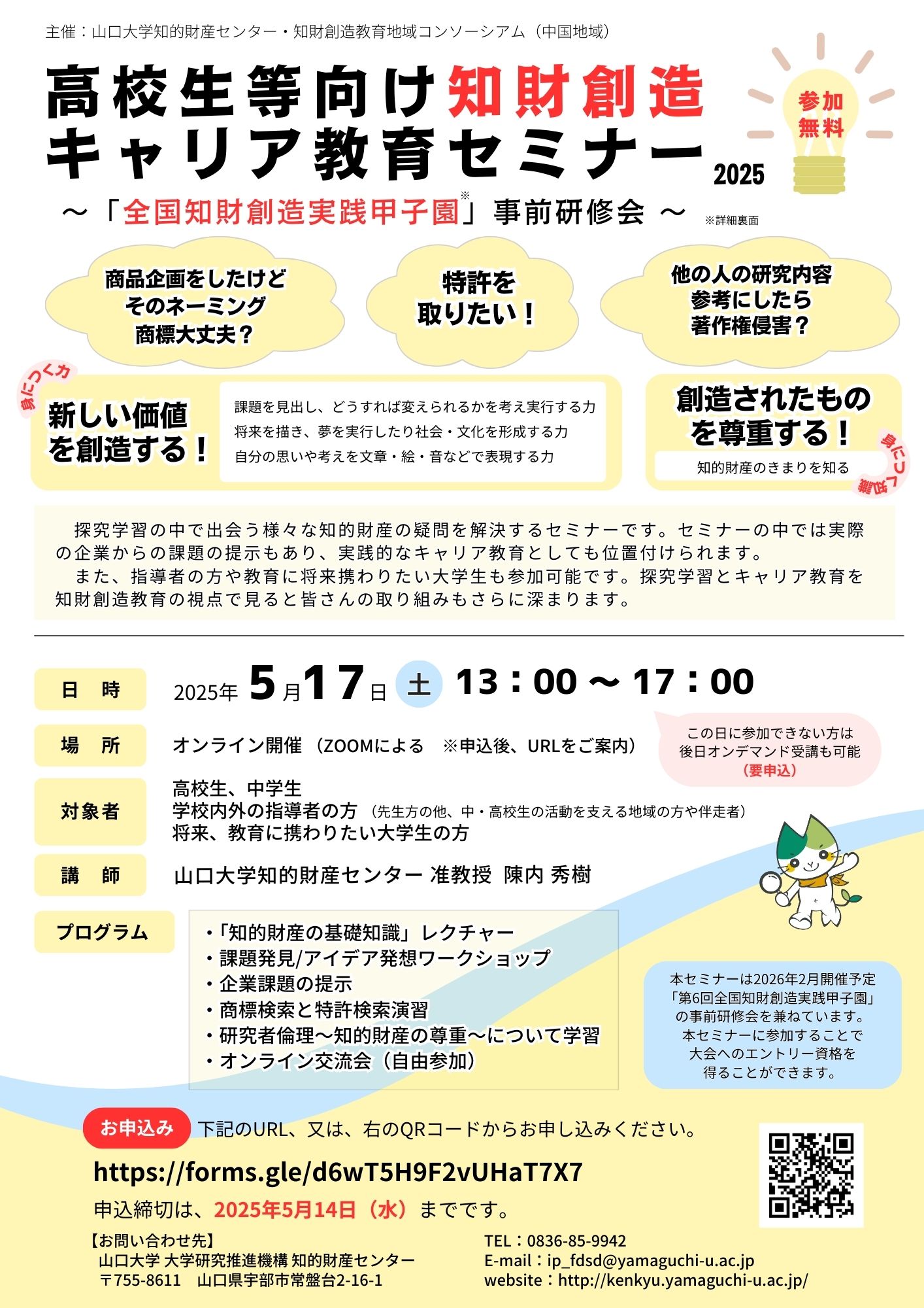 | 申込み・問い合わせ | 【お申込みについて】 上記、申込フォームよりお申込み下さい。 【お問い合わせ】 山口大学 大学研究推進機構知的財産センター TEL:0836-85-9942 E-Mail:ip_fdsd*yamaguchi-u.ac.jp(*を半角@に変更してください。) |