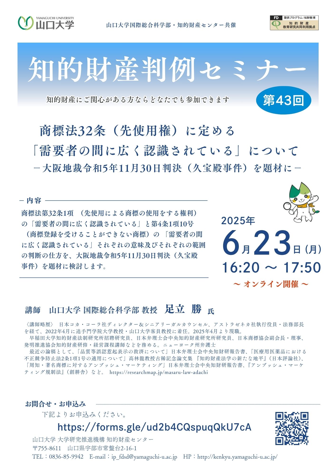 【1】講 師 山口大学国際総合科学部・教授 足立 勝 氏 【2】講 演 『需要者の間に広く認識されている』について ―大阪地裁令和5年11月30日判決(久宝殿事件)を題材に―