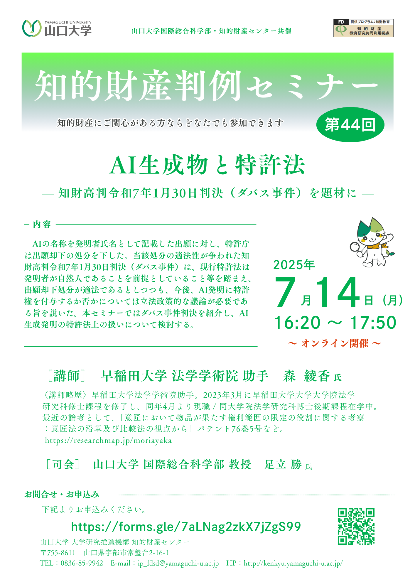 【1】講 師 早稲田大学 法学学術院 助手 森 綾香 氏 【2】講 演 『AI生成物と特許法』 — 知財高判令和7年1月30日判決(ダバス事件)を題材に —