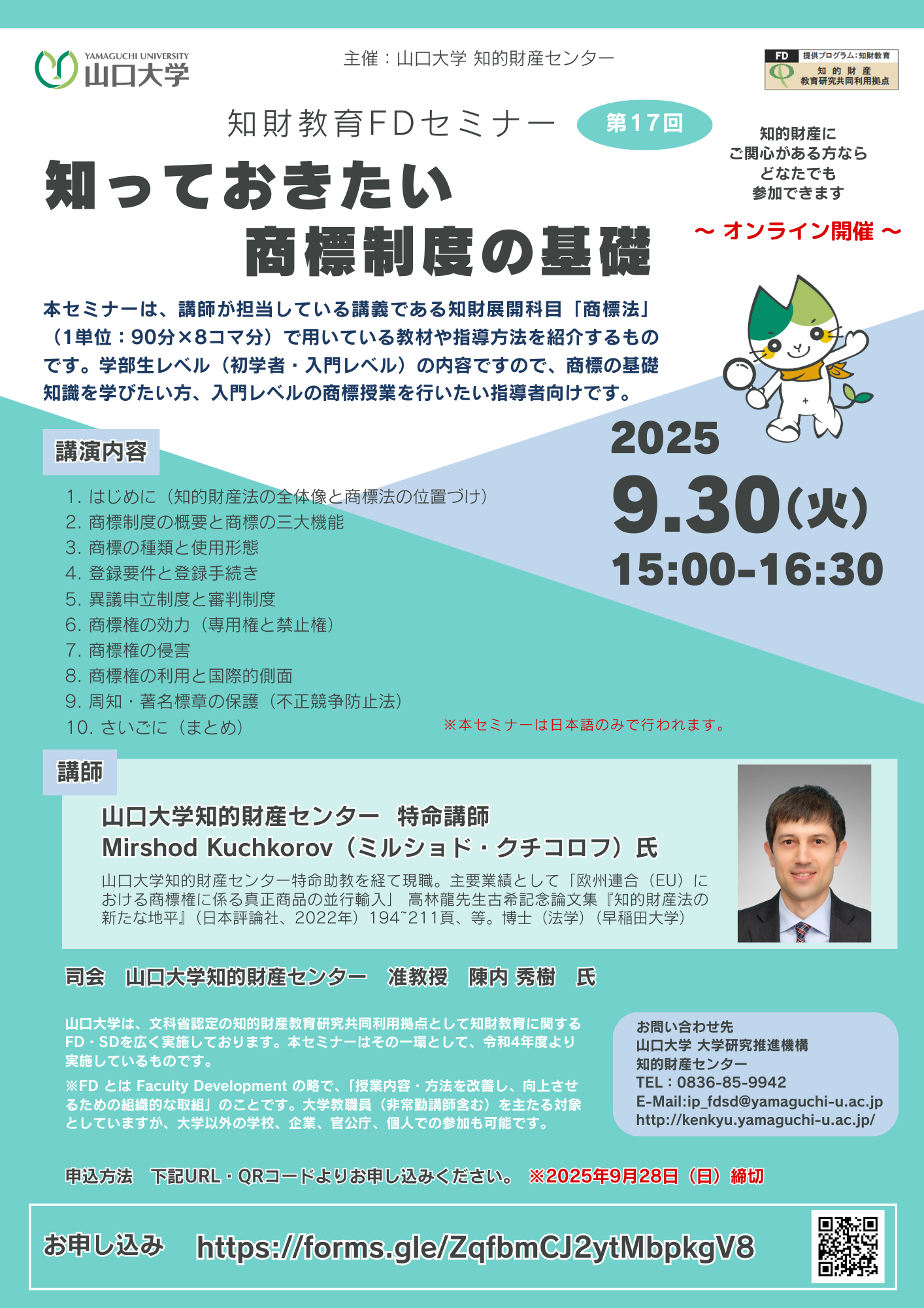 | 講師 | 山口大学知的財産センター 特命講師 Mirshod Kuchkorov(ミルショド・クチコロフ)氏 / 司会:山口大学知的財産センター 准教授 陳内 秀樹 氏 |