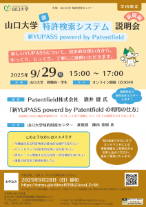 | 内容 | ■ 山口大学 新特許検索システム「新YUPASS powerd by Patentfield」説明会〈基礎編〉 ■【学内限定】