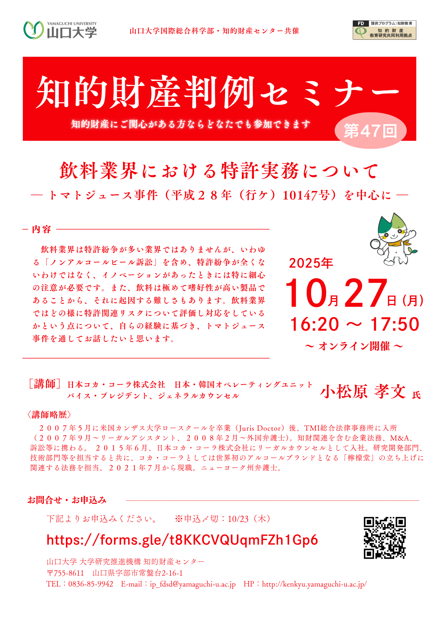 | 申込み・問い合わせ | 【お申込みについて】 上記、申込フォームよりお申込み下さい。 【お問い合わせ】 山口大学 大学研究推進機構知的財産センター TEL:0836-85-9942 E-Mail:ip_fdsd*yamaguchi-u.ac.jp(*を半角@に変更してください。) |