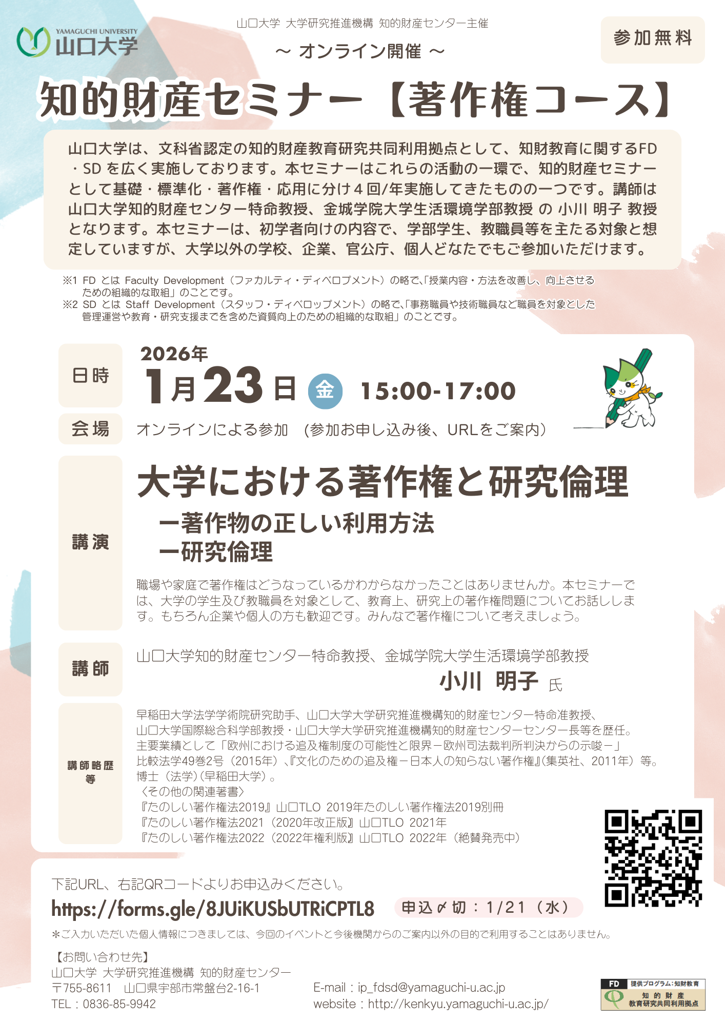 山口大学は、文科省認定の知的財産教育研究共同利用拠点として、知財教育に関するFD ・SD を広く実施しております。本セミナーはこれらの活動の一環で、知的財産セミナーとして基礎・標準化・著作権・応用に分け4回/年実施してきたものの一つです。講師は山口大学知的財産センター特命教授、金城学院大学生活環境学部教授 の 小川 明子 教授 となります。本セミナーは、初学者向けの内容で、学部学生、教職員等を主たる対象と想定していますが、大学以外の学校、企業、官公庁、個人どなたでもご参加いただけます。