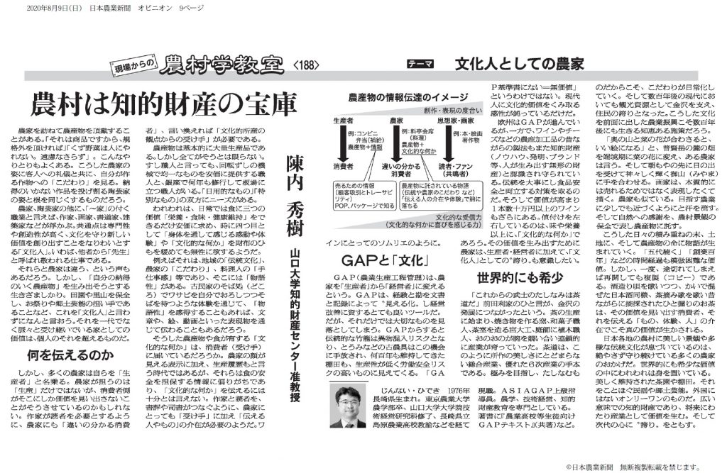 『日本農業新聞』において、知的財産センター 陳内 秀樹准教授の特集記事【現場からの農村学教室188 「農村は知的財産の宝庫」】が掲載されました。