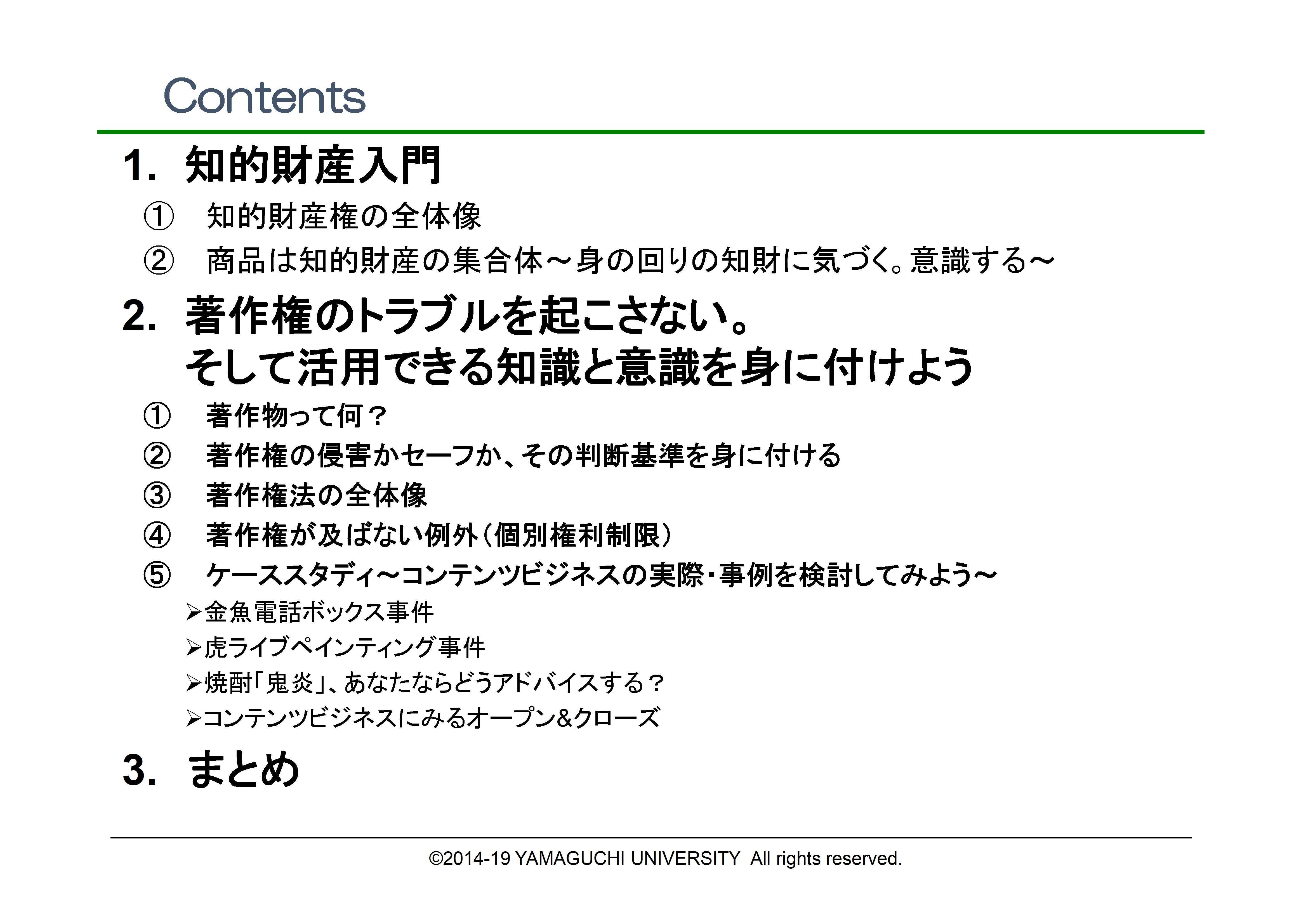 | 申込み・問い合わせ | 【お申込み】 下記の各事項をご記入の上、メールにてお申し込みください。 ・<メール件名> 1/19知財公開授業申込 ・ご所属、氏名、メールアドレス、電話番号 ・参加種別(生徒・教職員・一般) ・申込み先: ip_fdsd*yamaguchi-u.ac.jp(*を半角@に変更してください。) 【お問い合わせ】 山口大学 大学研究推進機構知的財産センター TEL:0836-85-9942 E-Mail:ip_fdsd*yamaguchi-u.ac.jp(*を半角@に変更してください。) |