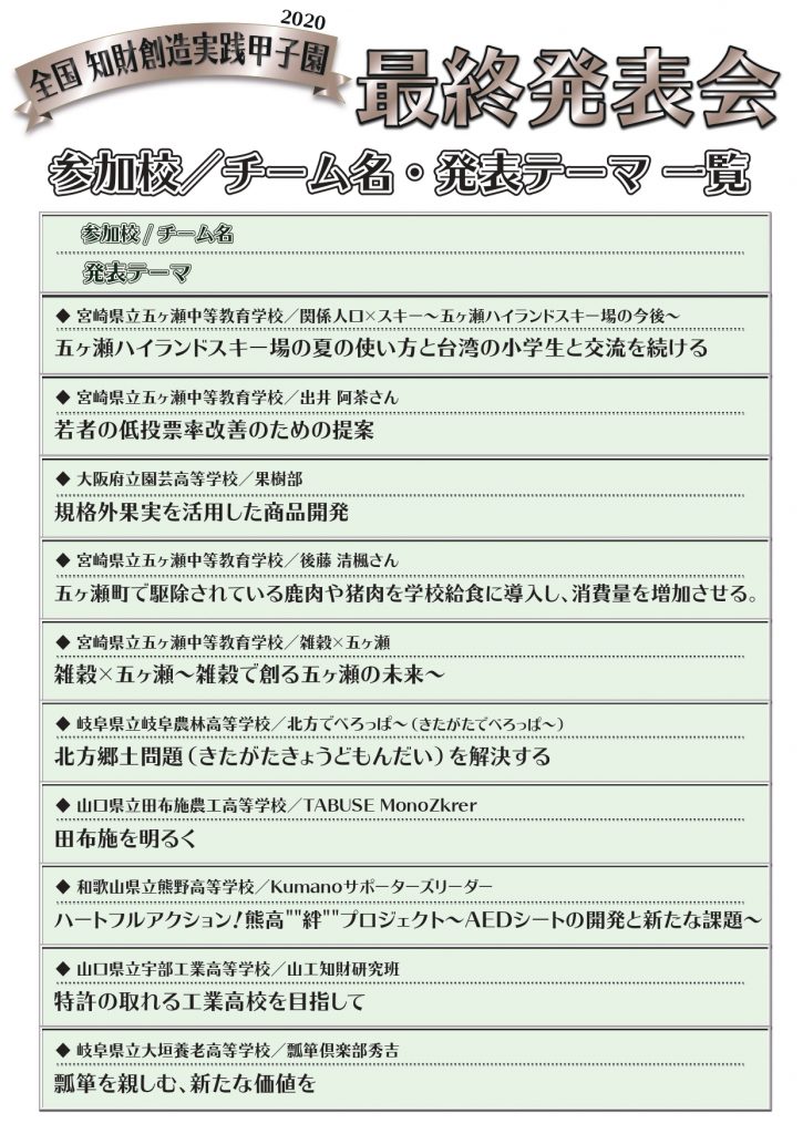 | 内容 | 全国 知財創造実践甲子園2020 本大会 ※オンライン開催 2020年9月より実施しております本イベントの、本大会(最終発表会)を開催いたします。 是非参観にお申込み下さい!