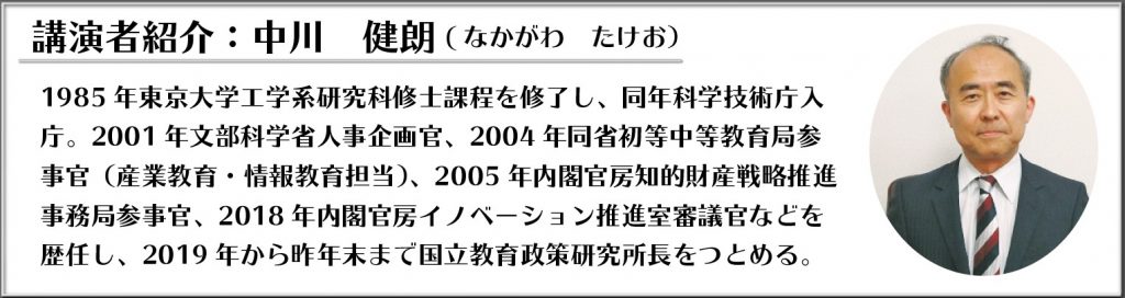 【プログラム】 1)9:30-9:35 開会行事 2)9:35-9:45 アイスブレイク:『ダンスうんどう』 »» NPO法人日本ダンスうんどう協会 ダンスうんどう塾・北九州支部長 田原 孝一 氏 3)9:45-10:10 基調講演:『知財創造教育のその先へ 豊かな未来に向けて』»» 前 国立教育政策研究所長 中川 健朗 氏 4)10:10-12:00 各校発表_1 5)12:00-13:00 -休憩- 6)13:00-13:10 アイスブレイク:『ダンスうんどう』 »» NPO法人日本ダンスうんどう協会 ダンスうんどう塾・北九州支部長 田原 孝一 氏 7)13:10-14:00 各校発表_2 8)14:00-14:30 意見交換会 9)14:30-15:00 閉会行事 ※日程は発表件数の変動によって調整する可能性がございます。