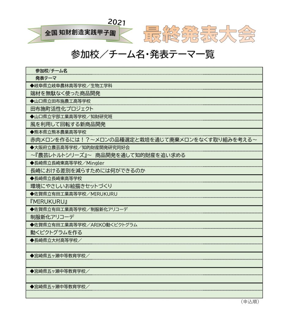 | 内容 | 全国 知財創造実践甲子園2021 本大会 *オンライン開催 【大会趣旨】 Society5.0価値デザイン社会に向け新しい学力観での教育が進む中、PBL等で高校生が商品や ビジネスモデルを生み出し実践的に学ぶケースが増えています。 その実践の中には、知的財産の創造・保護・活用が含まれています。しかし、多くは、それが 十分に意識されてはいません。結果、商標検索なしでの商品企画のネーミング、特許等の従来技術 検索なしでの製品・サービス化といった侵害に繋がる課題が生じつつあります。また、逆に、 せっかくのよい取り組みも知的財産として権利化されないまま知られてしまうことで、優れたビジ ネスモデルや製品アイデアも、企業での実施や社会実装が難しくなることも知られています。 そこで、それら生徒の取り組みについて、知的創造サイクルの観点に重きをおいた発表会を設け、 これら課題の解決に資することを目的とします。 また、これに応募する生徒は、各々の実践を知的財産の視点で見つめ直し、発表や共有で学び合 うことで新たな創発の機会に繋げます。