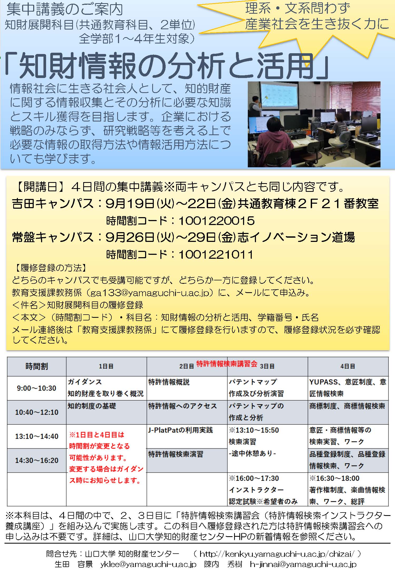 令和5年度の講習会は、集中講義/知財展開科目「知財情報の分析と活用」のなかに組み込んで実施いたします。