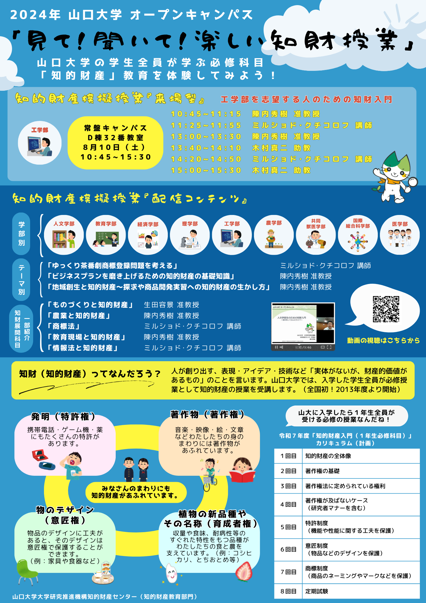 | 内容 | 『見て!聞いて!楽しい知財授業』 山口大学の学生全員が学ぶ必修科目「知的財産」教育を体験してみよう! 【全国初!】平成25(2013)年度より 知的財産教育を1年生全員に必修化!