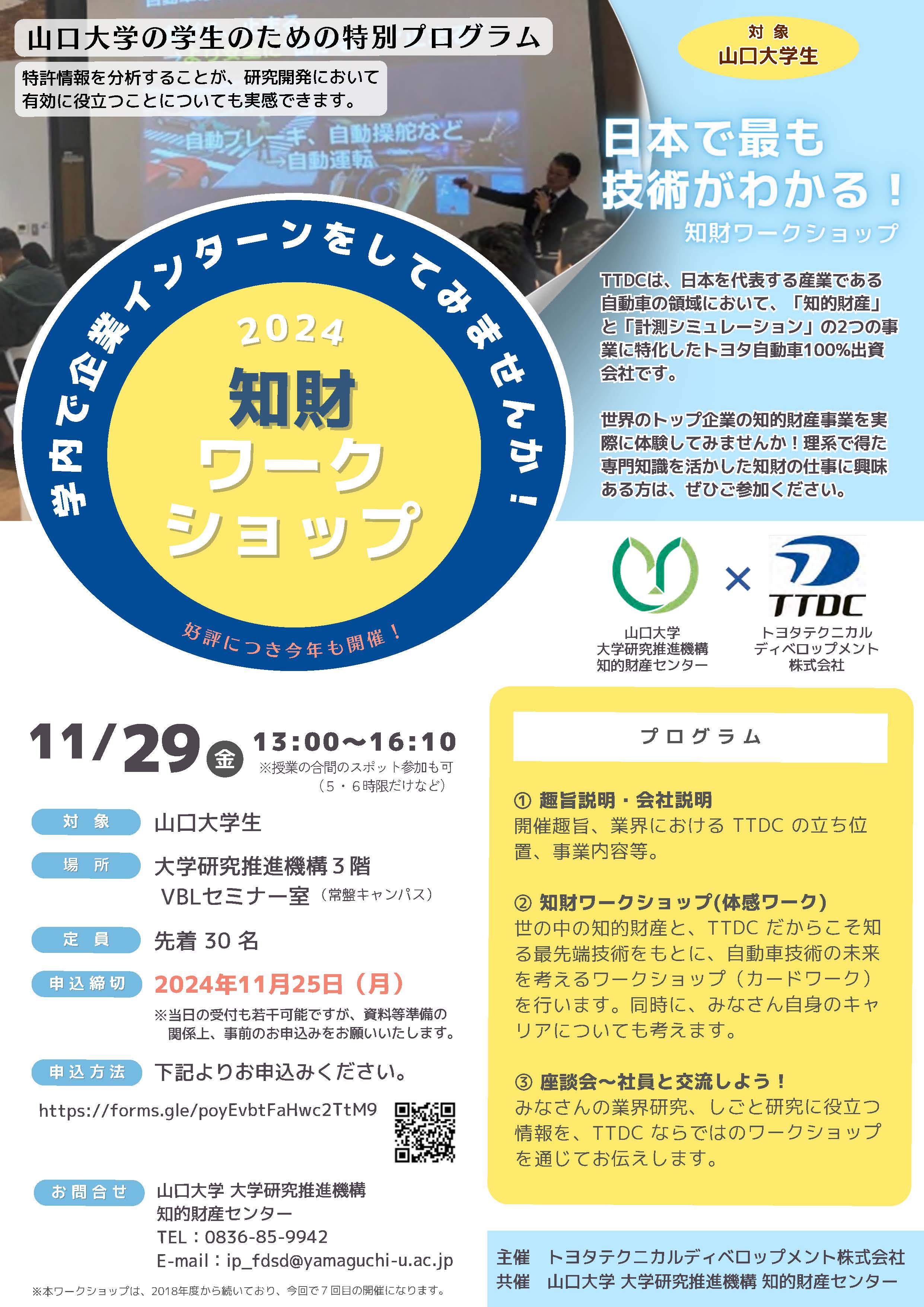 | 内容 | 【山口大学の学生のための特別プログラム】好評につき今年も開催! ◆◆日本で最も技術がわかる知財ワークショップ◆◆ ~学内で企業インターンをしてみませんか!~ TTDCは、日本を代表する産業である自動車の領域において、 世界のトップ企業の知的財産事業を実際に体験してみませんか!