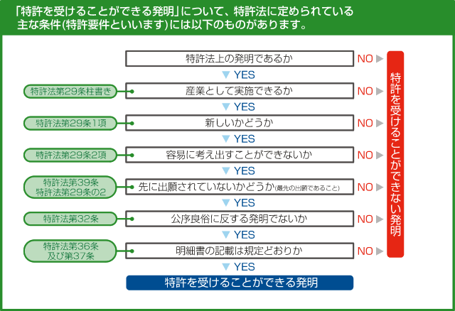 特許法上の発明に該当していても,全ての発明が特許を受けられるわけではありません。『特許』とは,「特許法に基づいて,独占排他権である特許権を与えること」をいいますので,特許を受けるためには,真に産業の発達に寄与することのできる発明に特許権を付与するため,特許法で定める「特許を受けることができる発明」の条件を満たす必要があります。