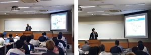 続いて、研究講演会として、稲葉和也教授、安部浩司教授から研究テーマ・シーズの紹介がありました。