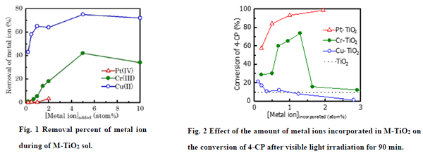 無機半導体光触媒である酸化チタン(TiO2)は、紫外光照射時のみ、伝導帯に電子が励起することで、価電子帯に強力な酸化力を有するホールを生じる。このホールにより環境汚染物質である有機物の酸化分解し無害化する。しかし、紫外光は、太陽光に約3%しか含まれていない。太陽光有効利用の観点から、可視光応答型光触媒の開発が望まれている。我々は、透析によるゾルの精製過程を導入した新規ゾルーゲル法によって、高比表面積を有するTiO2の合成法を確立している。得られたTiO2ゾルに金属イオンを添加するだけで、可視光応答型TiO2(M-TiO2)の合成が簡単できる。