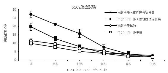 現在私達は、ある特定の分子をヒトリンパ球に遺伝子導入することでリンパ球の機能を高め、既存の悪性腫瘍治療薬と併用した際にその治療効果を向上させる新規抗腫瘍免疫療法の開発を行っている。当該分子を遺伝子導入したヒトリンパ球は、51Cr放出試験において悪性腫瘍治療薬存在下での腫瘍細胞に対する傷害活性が増強しており、in vitroにおける当該分子の有用性を確認できた(下図)。また、in vivoにおける当該分子の有用性を確認するため、超免疫不全マウスであるNSG(NOD.Cg-PrkdcscidIl2rgtm1Wjl/SzJ)マウスにヒト由来の悪性腫瘍細胞株を生着させたxenograftモデルを作成し、当該分子を遺伝子導入したヒトリンパ球と悪性腫瘍治療薬の併用による治療効果の検討を行っている。
