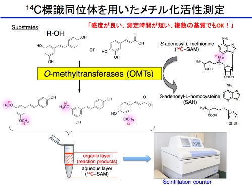 二次代謝産物の多くはアシル化や配糖体化、プレニル化などの修飾反応を受けて構造多様性が生み出されるわけですが、その修飾反応の一つにO-メチル基転移酵素によるメチル化があります。例えば、スパイスの香り成分であるオイゲノールがメチル化されると、フレッシュなハーブ臭へと香気特性が変わります。このような反応に関わるO-メチル基転移酵素の性質を一つでも多く明らかにできれば、酵素の精緻な反応制御機構の理解や酵素機能の進化がわかるようになります。システム生物学・RI分析施設では、ラジオアイソトープ標識されたS-アデノシルメチオニン(SAM)をメチルドナーとしてO-メチル基転移酵素の機能解析を行い、ショウブ(Acorus calamus)からレスベラトロールを特異的に認識し、メチル化する酵素の発見に成功しました[1]。レスベラトロールがメチル化されると親油性が高まり生体内に長く留まることから、生理活性が増強することが知られています。今後は、本研究で獲得した酵素遺伝子を利用した植物代謝工学、合成生物学による安定的な有用物質生産への応用も期待されています。