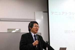 シンポジウムでは、丸本学長挨拶の後、先行実施機関である東京農工大学・工学研究院の中川正樹教授が、「TT先行実施機関の経験から―導入・定着への取り組み―」と題し、事業の運営体制やTT教員の公募など同大学の制度導入の事例を交えながら、制度を導入する際のポイント、導入後のメリットや配慮すべき事項について説明しました。実際に、同大学のTTの制度設計や拠点の立ち上げに若手人材育成拠点長として携わってこられた中川氏の話に、参加者たちは熱心に耳を傾けていました。質疑応答では、予定の時間を超過するほど多くの質問がありました。