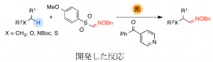 上條先生は、炭素鎖に反応促進剤として芳香族ケトンを添加し、2種類の原料を光照射下で反応させるだけの簡便な操作で、高い精度でアルデヒド等価体をつくる方法を開発しました。等価体より得られるアルデヒドは、多様な反応性を示すことが知られているため、合成化学的に非常に有用な化合物です。つまり本研究では、短い工程で安価な原料をより価値の高い物質に変換する新しい方法の開発に成功しました。