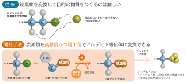 今回開発に成功した分子変換ツールは、過去には存在しなかった全く新しいタイプのものです。したがって、短い工程数で高付加価値物質をつくれるようにしただけでなく、有用物質のつくり方に