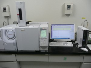 【ガスクロマトグラフ質量分析計】 分子量を測定する装置です。反応後にどのような質量を持つ分子ができたのかを確認するために使います。反応開発には欠かせません。 |