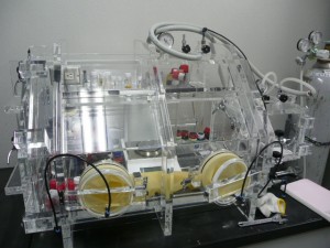 【グローブボックス】 空気中で扱うことが困難な試薬を、この中で手軽に扱うことができます。