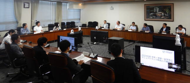 後列向かって左から、上西研理事・副学長、葛崎偉特命理事・副学長、進士正人理事・副学長、相田紗織助教(創成科学(工))、富永直臣助教(医学系(保))、松野浩嗣理事・副学長、溝部康雄理事・副学長、佐藤晃一副学長