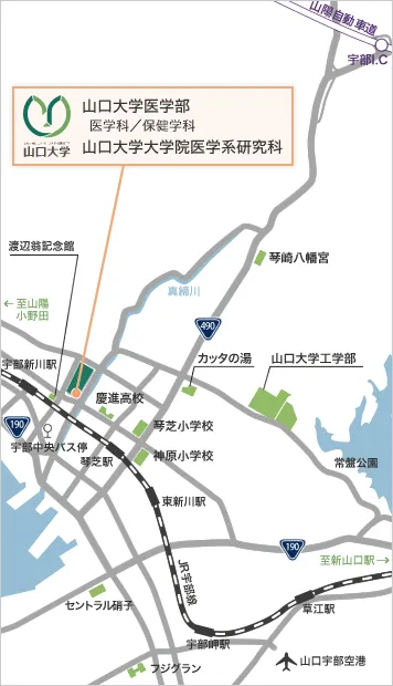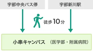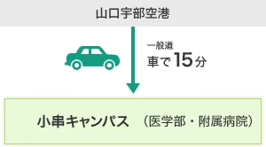 交通アクセス 学部案内 > 交通アクセス 山口大学小串キャンパス(医学部・附属病院)への交通アクセス方法 所在地 〒755-8505 宇部市南小串1丁目1-1 ※宇部空港からはバスで宇部新川まで来ることもできます バス時刻表 小串キャンパスガイド 山口県への交通アクセス方法 トップページへ戻る