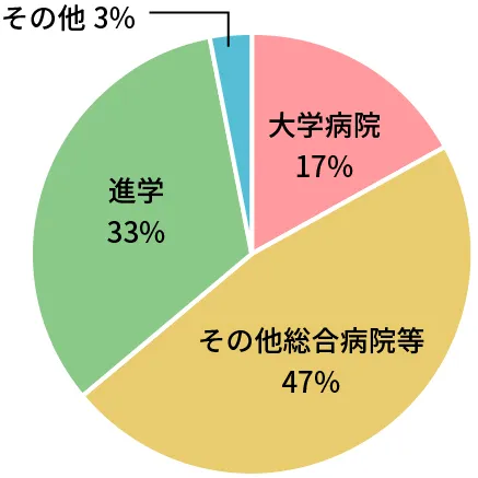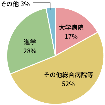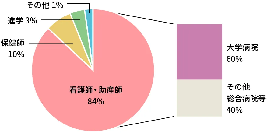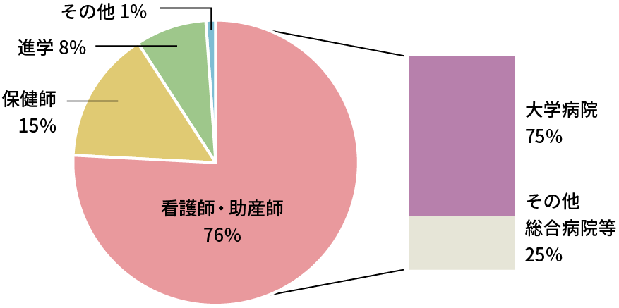 看護学専攻の約80%、検査技術科学専攻の約70%は大学病院や総合病院へ就職します。