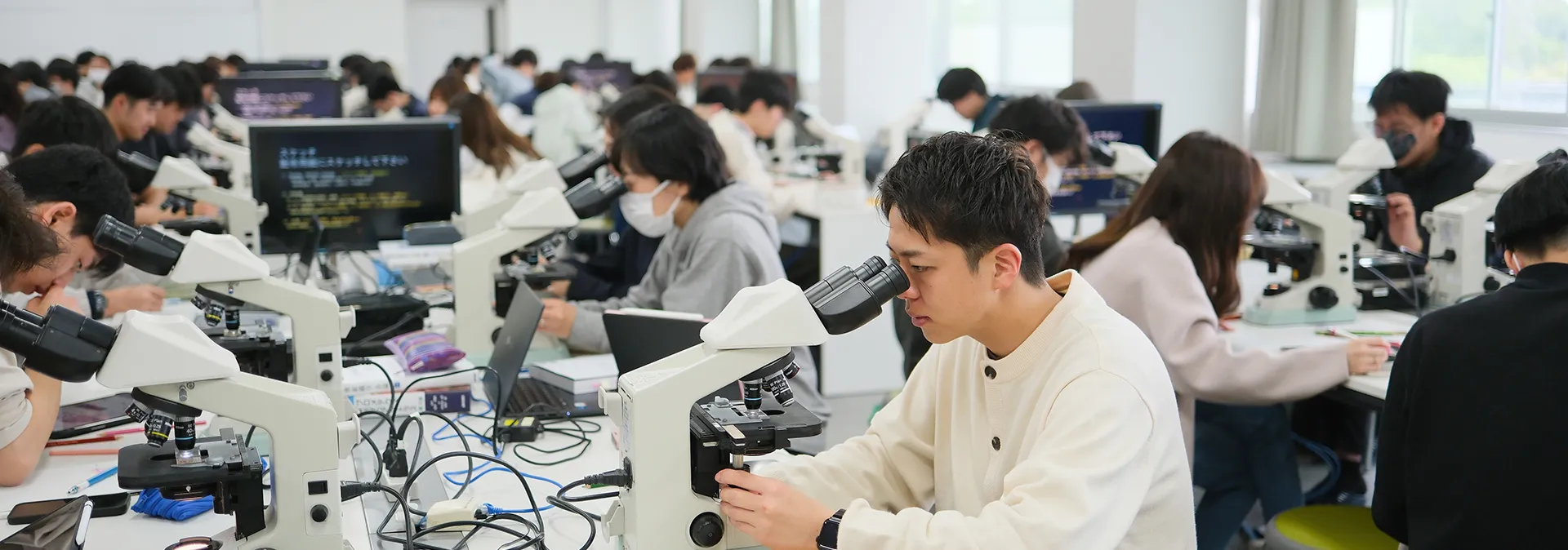 医学科には解剖学・生理学等の15の基礎・社会系講座と、内科・外科等の24の臨床系講座があります。革新的な電子シラバスと、臓器・系統別に編成した独自のコース・ユニット制カリキュラムに基づき、多方面から医学を学び、幅広い研究視野と豊かな人間性を培いながら、自発的な学習能力を育成する教育が特徴です。