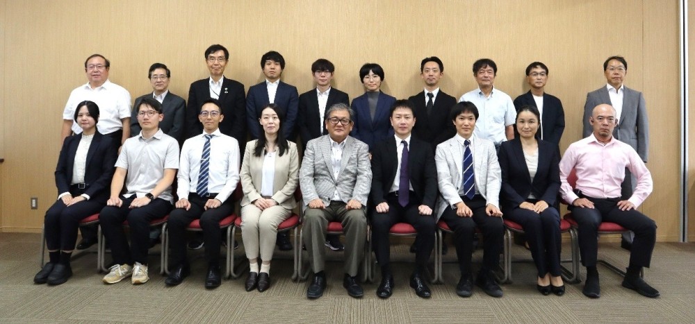 後列左から、・上西 研 理事・副学長・葛 崎偉 理事・副学長・進士 正人 特命理事・副学長・大学院創成科学研究科(理学系学域) 江島 圭祐 助教・大学院創成科学研究科(工学系学域) 白石 僚也 准教授・大学院創成科学研究科(工学系学域) 白石 レイ 准教授・大学院医学系研究科(保健学専攻) 富永 直臣 助教・松野 浩嗣 理事・副学長・溝部 康雄 理事・副学長・佐藤 晃一 副学長