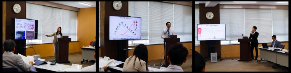 冒頭、谷澤学長から山口大学を取り巻く状況の説明と若手教員への期待が表明されました。続けて、令和6年10月に着任した大学院創成科学研究科(農学系学域)の武 靖(ウ ジン)助教、令和7年4月に着任した共同獣医学部の辻 竣也(ツジ シュンヤ)助教、令和7年度創発的研究支援事業に採択された医学部附属病院の田村 功(タムラ イサオ)講師からスライドを使った自己紹介・研究紹介が行われました。それぞれの発表に対し、出席者から高い関心が寄せられ、各発表後には活発な質疑応答が行われました。