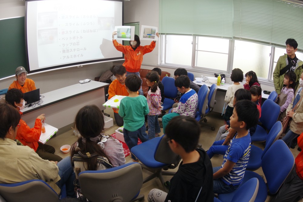 今年は、体験企画や企画ブースが15個、わくわく体験ツアー企画が6個、合計21個の企画からなり、こどもたちに科学の楽しさ、おもしろさを体験してもらいました。特に、学生による企画がたくさんあることが特徴で、理学部各学科や教育学部理科教育選修の学生たちがサイエンスに関する企画を立案し、実施しています。また、防府市青少年科学館ソラールによる企画も行われました。多くのこどもたちが目をキラキラさせて理科実験の面白さにどっぷりと浸った一日となりました。