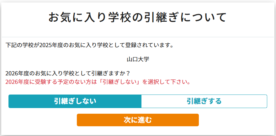| A | こちらはお気に入り学校を引き継ぐかどうかの設問であり、「引継ぎしない」を選択した場合でも成績開示情報の閲覧は可能です。 |
