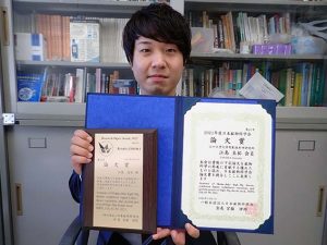学会から送られた論文賞の盾と賞状を持つ江島さん。