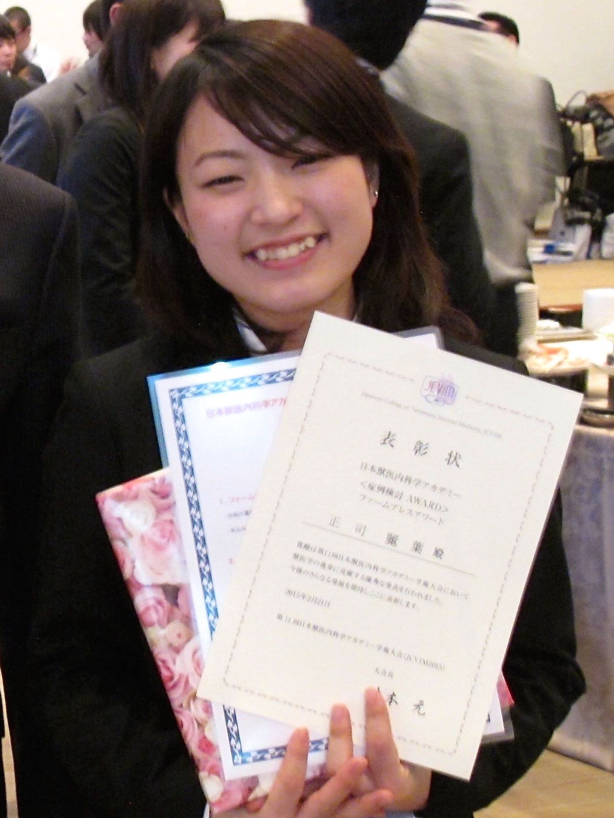 本学獣医学科5年の小林宏祐さんが研究アワード、同4年の正司麗葉さんが症例検討アワードを受賞しました。