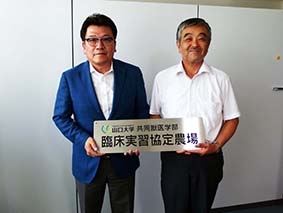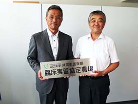 産業動物関連事業に取り組む企業が少ない山口県において,深川養鶏農業協同組合は山口県を代表する鶏の生産組合として,鹿野ファームは県内唯一の豚飼育から加工まで行う企業として,優秀な管理獣医師のもと産業動物の優れた飼育管理を行っています。今回,両事業所を産業動物総合臨床実習の「臨床実習協定農場」に指定することで,共同獣医学部の学生が,実際に手を動かして参加する「Hands-On臨床実習」の実施が可能となりました。 最後に,木曽学部長より末永組合長と隅社長へ「山口大学共同獣医学部・臨床実習協定農場」の銘板が手渡され,互いに今後の連携協力が確認されました。