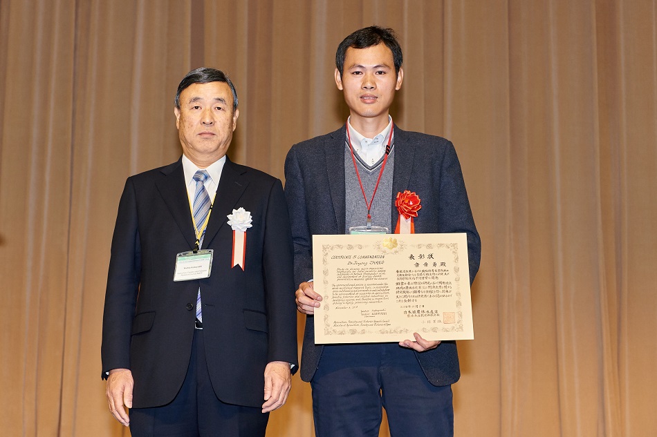 ※表彰を受けるZHANGさん(向かって右。左は小林・農林水産技術会議会長)