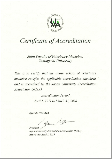 (認定期間:平成31(2019)年4月1日~平成38(2026)年3月31日)今回の評価結果は、共同獣医学部が平成24年度の学部開設以来、6年間に渡り進めてきた教育改革やその教育を支える組織・運営体制などの取組が高く評価された結果と捉えており、来年度(H31)に受審を予定している欧州獣医学教育機関協会(EAEVE)の認証取得に向けても弾みが付く結果となったところです。