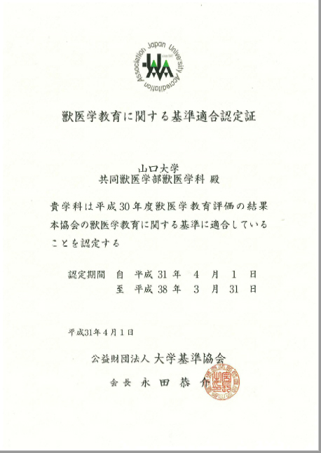 共同獣医学部(獣医学科)においては、獣医学教育学士課程の水準の向上並びに評価を通じて獣医学教育学士課程の質を社会に対して広く保証することを目的とした「獣医学教育評価(評価主体:大学基準協会)」を平成30年度に受審し、この度、獣医学教育に関する『基準に適合している』と認定されました。