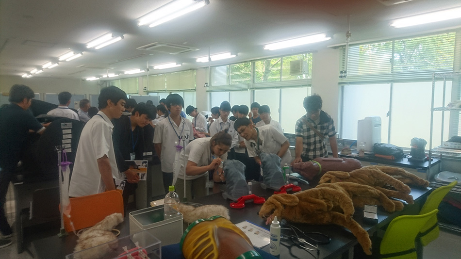 講座では、本プログラムの代表者である共同獣医学部・佐々木教授(大動物臨床学)の講義から、動物の模型を使った実習、各施設・設備の見学及び最新の治療機器を用いた体験実習などが行われ、県内外から高校生19名と中学生1名(合計20名)の参加があり、プログラム終了後には、参加者全員に「未来博士号」が授与されました。 共同獣医学部においては、今後も動物福祉を基盤とした獣医学教育を推進するなかで、動物を癒すための再生医療研究に取り組むとともに、未来を担う高校生を対象とした事業にも積極的に取り組んで参ります。