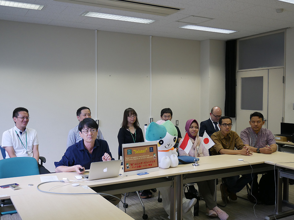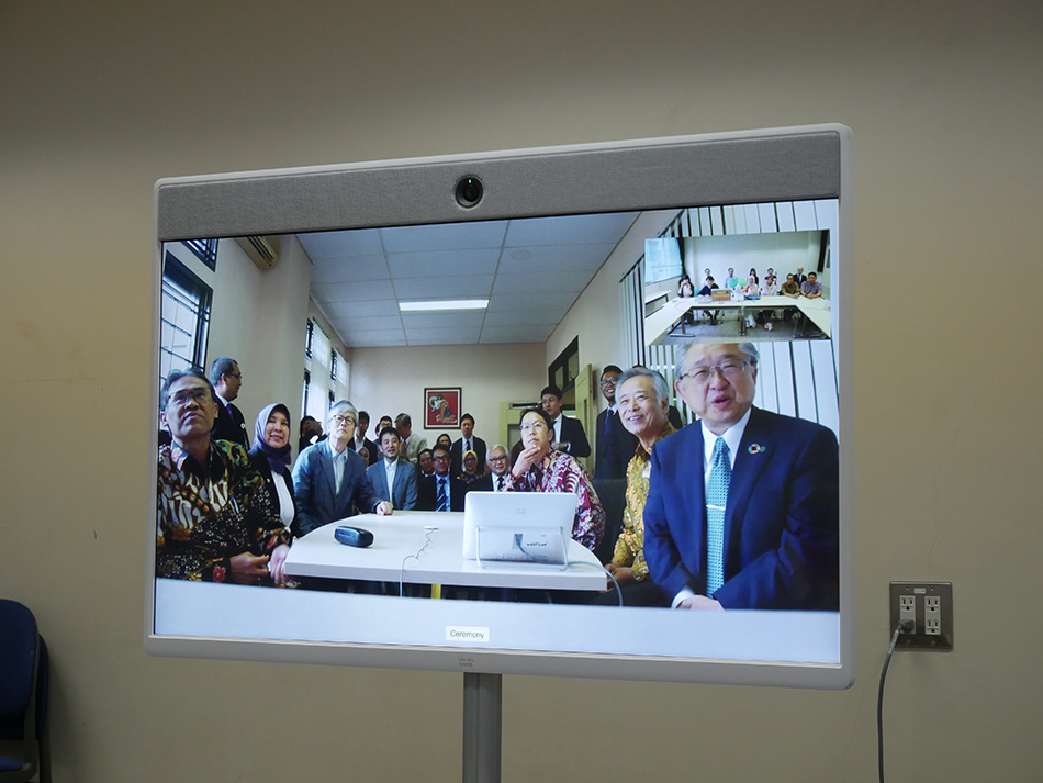 9月20日(金)、本学の国際交流協定校であるガジャマダ大学(インドネシア)との国際共同事務局の開所式典があり、同時にTV会議システムの開通セレモニーが行われ、本学から岡正朗学長、福田隆眞副学長(教育学生担当)、三浦房紀副学長(国際連携担当)、佐藤晃一共同獣医学部長ほか9名が出席しました。
