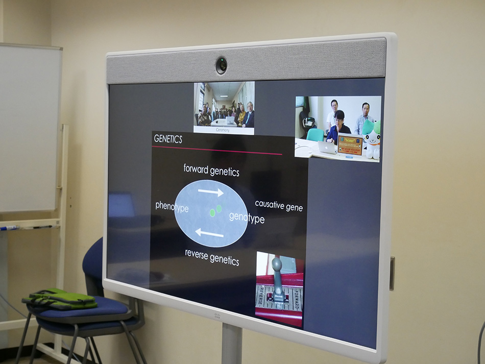 ※写真をクリックすると拡大画像をご覧いただけます。 山口大学側の送信時の様子 (前列左から 加納教授、インドネシア出身留学生)
