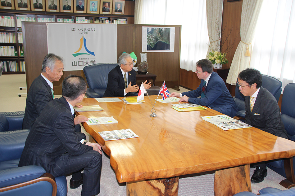 表敬訪問の場では、岡学長から、山口大学の概要として本学の沿革やビジョン、教育面での取り組みとして、知財教育やデータサイエンスなどに関する説明があり、Professor David Argyle前獣医学部長から、エディンバラ大学獣医学部の紹介がありました。