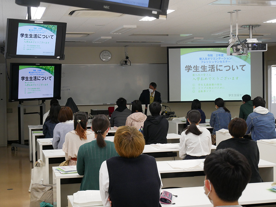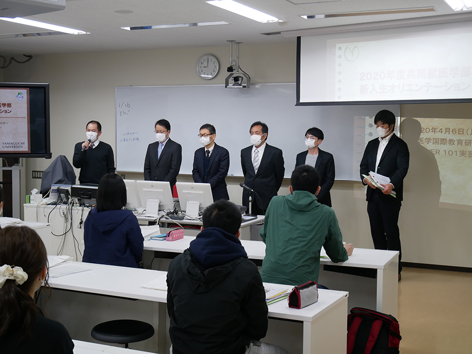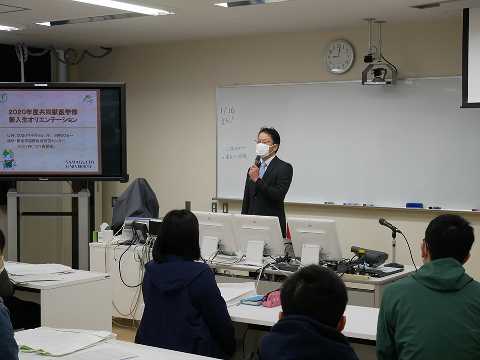 オリエンテーションでは、学部長からの歓迎の挨拶の際、共同獣医学部の学生としての心構えなどに加えて、今般の新型コロナウイルスに係る状況についての話があった後、全学の高橋学生支援センター長から「学生生活全般について」話があり、その後、安全衛生や共通教育、専門教育の説明などが行われました。